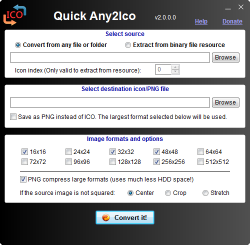 Quick Any2Ico can create and extract icons in PNG and GIF format. It supports selecting the output resolution (from 16 x 16 pixels to 512 x 512 pixels). Extraction is possible from any file or folder. For PNG files, the data size can be reduced by compression.