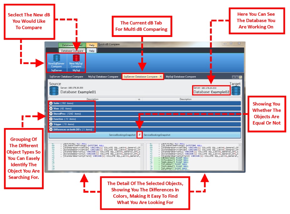 Quick dB Compare offers an intuitive environment to locate differences between two databases. Any difference is displayed and highlighted. The program supports working with MS-SQL Server versions 2005, 2008, 2012, 2014 and MySQL editions.