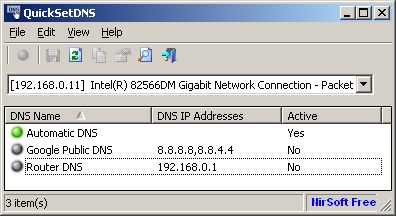 QuickSetDNS makes it easy to change the DNS servers used to connect to the Internet with this simple tool. You can set the desired DNS servers from the user interface by selecting from a list of DNS servers you have defined or from the command line without displaying the user interface.