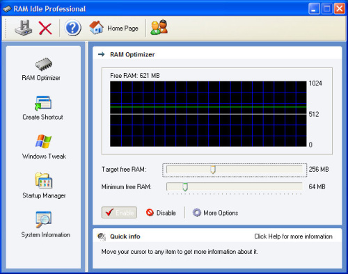 RAM Idle is a great memory management program that will make your computer faster and more efficient. Its essence is to clean the physical RAM memory that Windows and other programs work so wastefully with. RAM Idle also includes Cache management tools and a Windows startup manager to help in optimizing them.