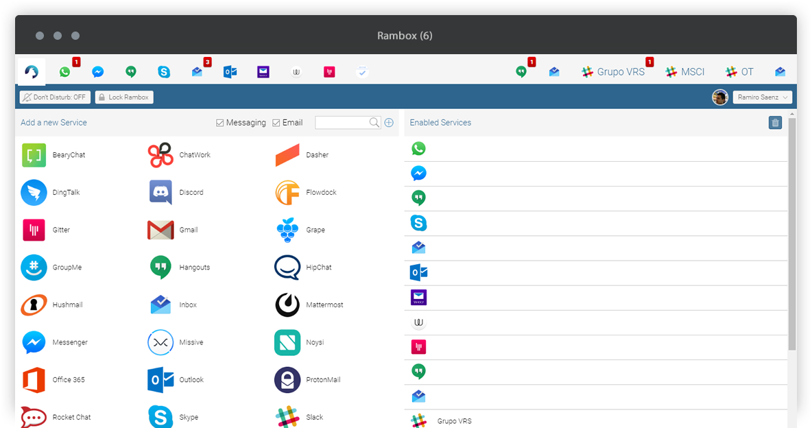 Rambox is an ideal, customizable communication tool that has the ability to utilize email clients and web communication services in a single main window. Gmail, Hushmail, Office 365, Yahoo! Mail, Outlook, Tutanota, ProtonMail and more. In addition, it supports popular messaging services such as WhatsApp, Yahoo! Messenger, WeChat, Wire, Facebook Messenger, HipChat, Google Hangouts, Telegram, Steam Chat, Voxer, Skype, Slack, Grape, Mattermost, GroupMe and more.
