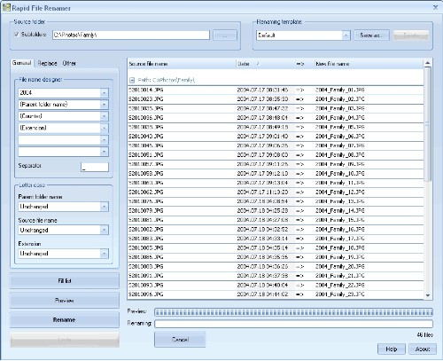 The purpose of Rapid File Renamer is to enable easy and convenient renaming of a large number of files according to set templates.