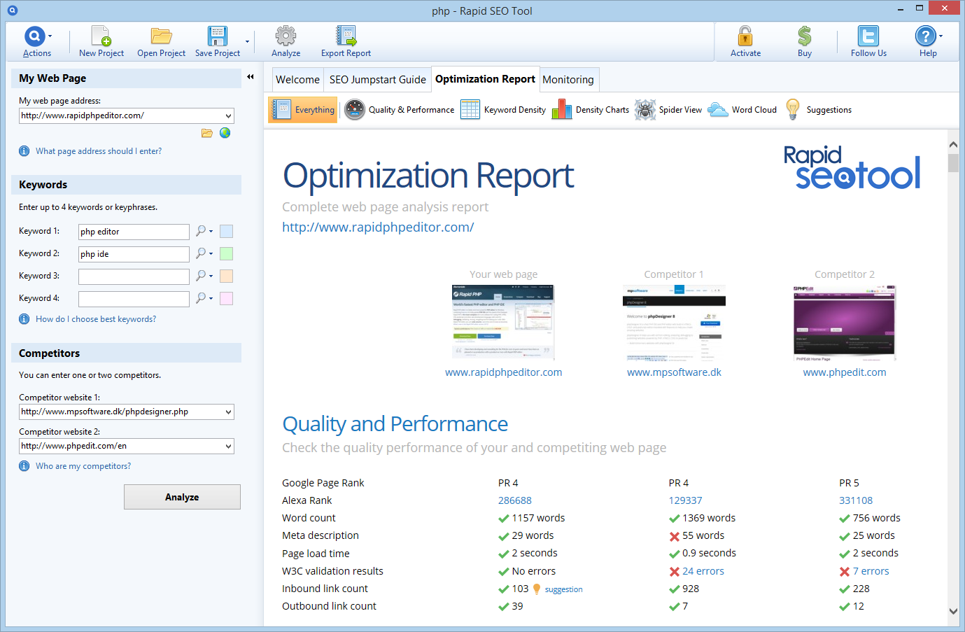 Rapid SEO Tool is a unique software for optimizing your website's position in search engines. It can raise the position of your website in search results. The program literally checks the code of the website and suggests what to improve to get better results.