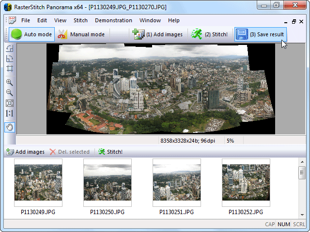 RasterStitch Panorama is designed to create panoramic images without extra effort. The process of creating a panoramic image is fully automated and requires no setup, in most cases the default settings work perfectly. Just select the images you want to join together. RasterStitch Panorama automatically corrects the colors and exposure to give you an excellent result.