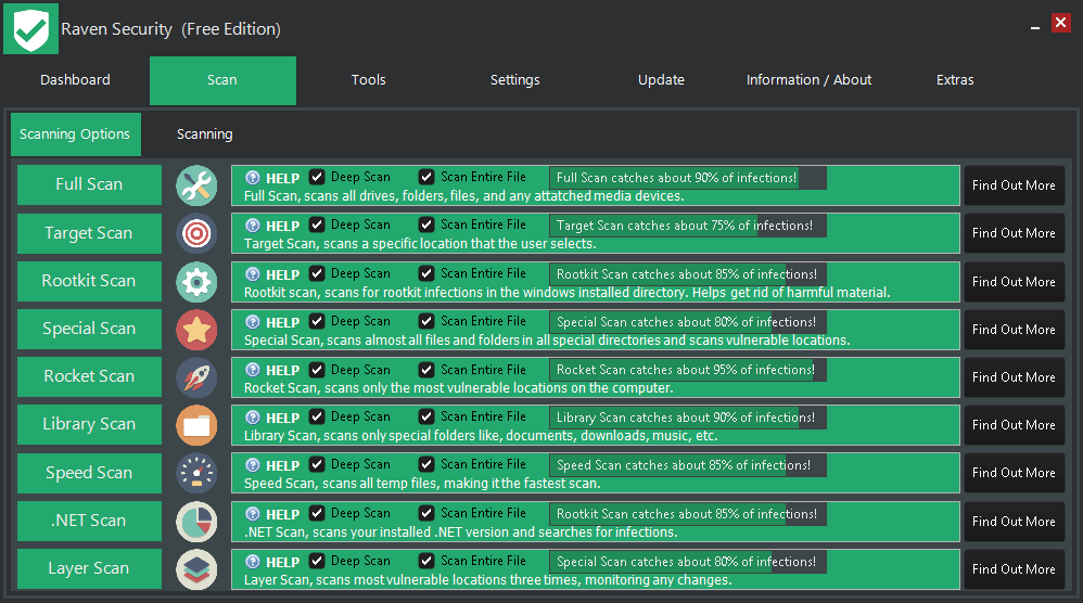 Raven Security is a reliable tool that is capable of detecting threats, malicious files and viruses on your computer. The application can perform localized, quick, or in-depth scans to detect malicious code or other threats to files. Additionally, once detected, it allows you to move files to quarantine or delete them outright.