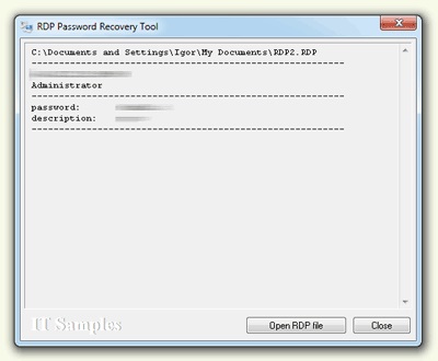 RDP Password Recovery Tool is designed to decrypt passwords stored in Microsoft Remote Desktop Connection inside RDP files. These RDP files are usually located in the My Documents subfolder.