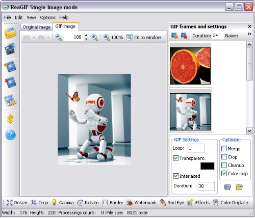 ReaGIF is a popular gif animator, allowing you to create animated gifs and convert files from common graphic formats to gifs. You can also convert in batch mode. The integrated editor offers the following features: resizing, rotation, cropping, brightness adjustment, contrast, red-eye reduction, watermark insertion and many artistic effects. It supports up to 35 or more graphic formats.