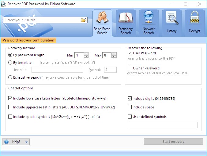 No matter how long ago your PDF document was password protected - Recover PDF Password supports all versions of Adobe Acrobat up to version 9 and supports Unicode password recovery, including Acrobat 9.x files. You won't encounter any problems when recovering a PDF password, no matter what language or keyboard layout it was created in.