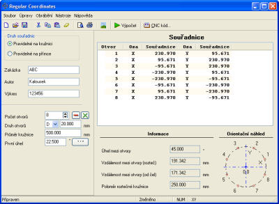 After entering the input data, the required coordinates are calculated. At the same time, in the case of calculating regular holes on a circle, an image is created showing the calculated holes. Once the calculation is complete, the coordinates can be printed, exported to another file and format, or a CNC program can be created to drill or tap these holes.