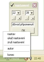 The program runs resident (in the background, displayed in the system tray next to the clock), after clicking the right mouse button (context menu pops up) you can set the time of the alert or the text of the alert. At the set time, it will remind itself with an information bubble.