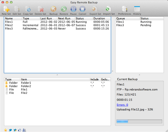 Remote Backup Magic is a program that is used to automatically back up your files remotely to an FTP server, email account or network drive. Simply drag and drop files or folders into the application, select a backup location, and you're done. In the settings options, you can choose the backup frequency and other settings.