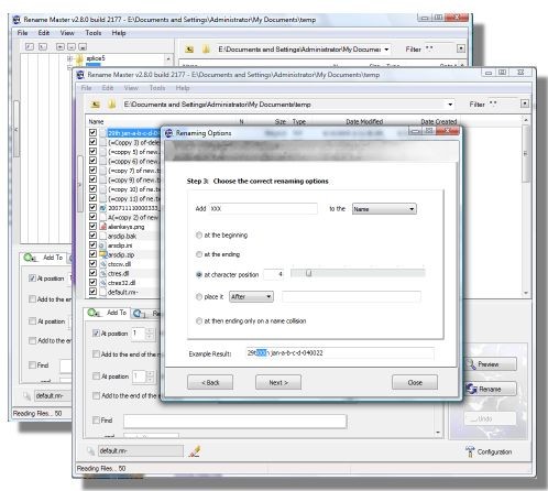 Rename Master is a free utility for renaming large groups of files quickly and easily. This utility allows you to add, remove, change parts of the file name. You can rename using various file properties, mp3 tags, JPEG JFIF and EXIF tags.