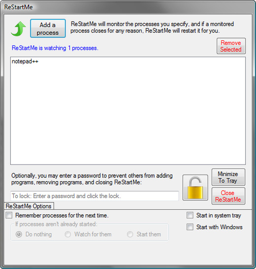 The program window, in which all processes can be monitored, minimizes to the system tray and can be password protected.Product details of ReStartMe | |