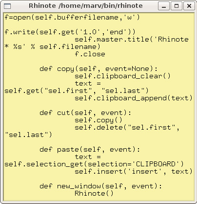 Rhinote is a simple Python/Tkinter script that provides virtual "sticky notes" on the desktop. It is useful for quickly jotting down notes or storing copied text to paste elsewhere later. Text can be cut, copied and pasted; notes can be saved (as plain text) and later viewed and/or edited in Rhinote or any other text editing application. Although there are many "sticky note" programs for virtually all computer platforms, Rhinote is extremely simple, lightweight, and "keyboard friendly."