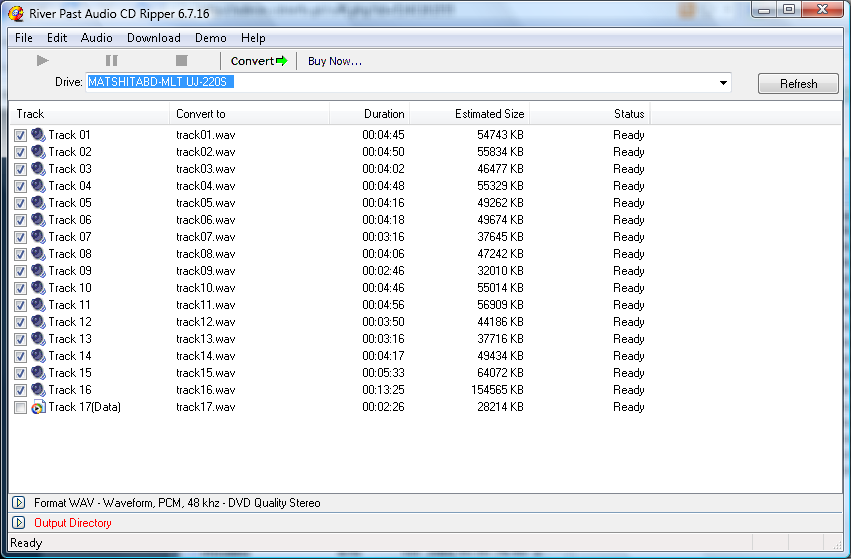 River Past Audio CD Ripper is an application for extracting audio files from audio CDs and then converting them to MP3, WAV, WMA, FLAC, AIF, AVI, MKA or OGG format. The program has a user-friendly interface and displays a list of audio tracks contained on the disc as soon as the CD is inserted into the drive. You then choose which files you want to convert, the output destination and the output file format. In addition, you can configure audio settings such as compression, channel, number of bits per sample, sample rate, bit rate and more.