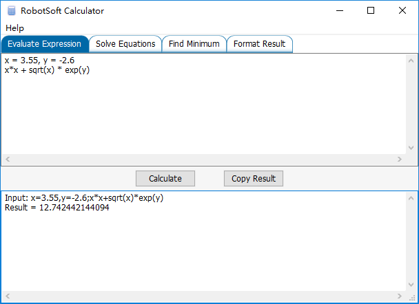 RobotSoft Calculator is an advanced calculator, but very easy to use. It can evaluate expressions and solve equations. And it can easily perform nonlinear optimization.