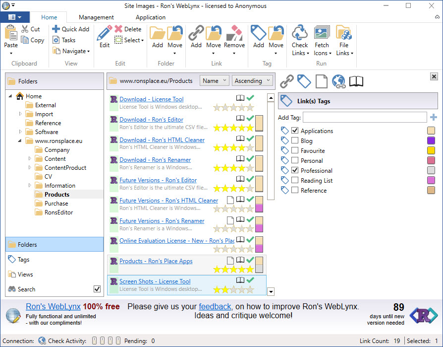 Rons WebLynx is a tool for storing links to websites. The tool can be a replacement for the standard bookmark manager. You can import links from the clipboard, web pages, or directories as well as browsers.