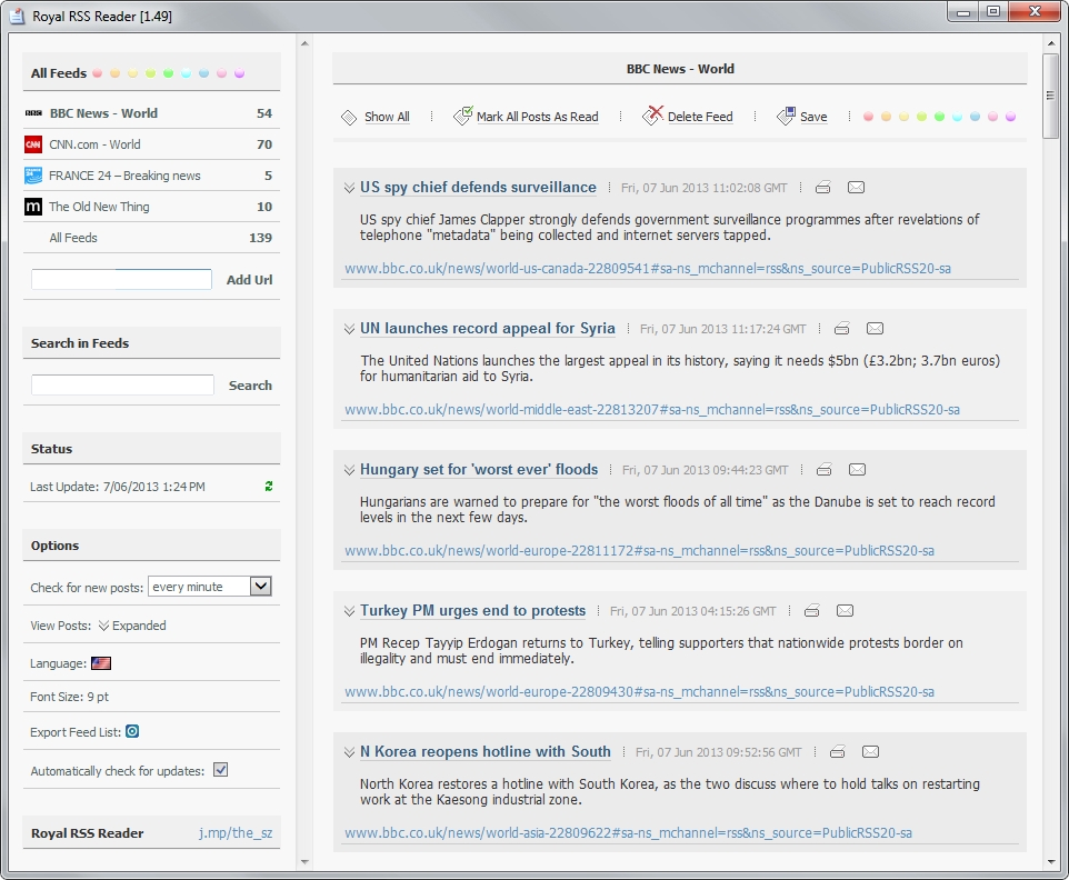 Royal RSS Reader is a small and simple utility that reads RSS feeds. This program starts automatically at startup, but it is possible to disable this startup. You can also import your Google Reader feeds, use Google Export to extract the subscriptions.xml file and drag it into Royal RSS Reader.