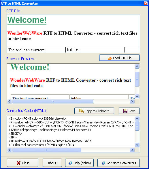Use the RTF to HTML converter to convert standard RTF files to HTML code. This tool uses IE's internal conversion features and should convert any standard RTF document. Please note that the RTF to HTML converter cannot handle images and other external objects. In addition, not everything Word creates as an RTF file will be converted - for example, table background colors may be lost, as well as some font settings... The best way to see the result is to convert the relevant RTF file and check the HTML output.