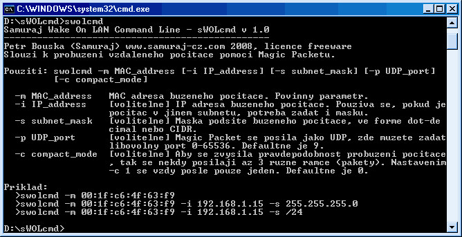 The sWOLcmd program is used from the Windows command prompt. To use it, simply enter the MAC address of the computer you want to wake up.