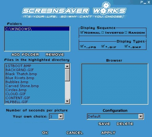 ScreenSaver Works is a simple and customizable tool that allows you to create custom screensavers from your favorite images and photos. *.jpg, *.gif and *.bmp.