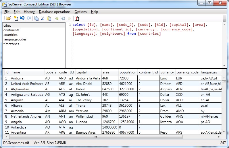 SdfBrowser is a program that allows you to run queries against Microsoft SqlServer Compact Edition (SDF files) and retrieve database info. The latest version works with SDF files version 3.0, 3.5, 4.0 and includes database drivers.
