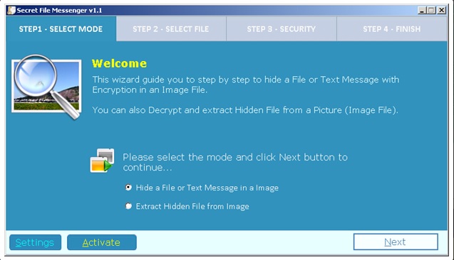 Secret File & Text Messenger is an innovative software with which you can easily encrypt a file or text message, and hide it in an image. You can also decrypt and extract your hidden file or message. Keep your private data safe with the help of Secret File Messenger.