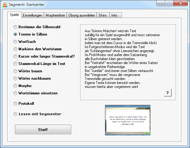 An important prerequisite for successful mastery of spelling and reading is the ability to divide strings of letters (words) into manageable parts. Segmenti supports the segmentation of German words into syllables or morphemes with the help of learning games. It includes ten game modules and a reading module.