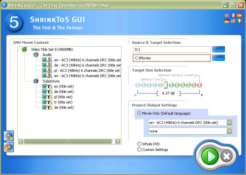 ShrinkTo5 can copy movies in excellent image quality. It offers high-speed mode, the ability to copy encrypted data, structural error correction, preview during copying, analyze and copy at the same time, etc. The program is available in many languages.