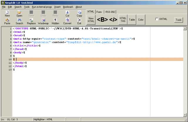 SimpEdit is a Notepad replacement with syntax highlighting for 21. ASM,C++, C#.CSS, HTML, INI, JAVA, JS,BAT/CMD, INNO, NSIS, Pascal/Delphi, Perl, PHP, Python, SQL, TCL, TeX, XML, source files and Txt. It also allows: encryption with Twofish 256 bit, header and footer printing, HTML browsing with internal corners, hexeditor, conversion of special characters to HTML entities, HTML tag checking, and conversion of text emails to images.