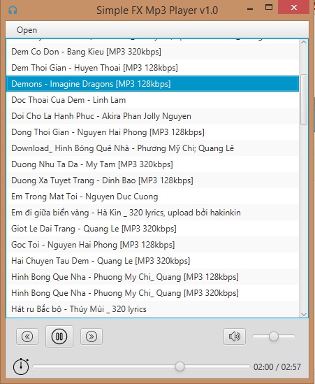 Simple FX Mp3 Player is a simple music player. It contains basic but most important features. It loads songs from a selected directory and arranges them into a playlist. The controls include two sliders, volume and an indication of the current part of the song being played.