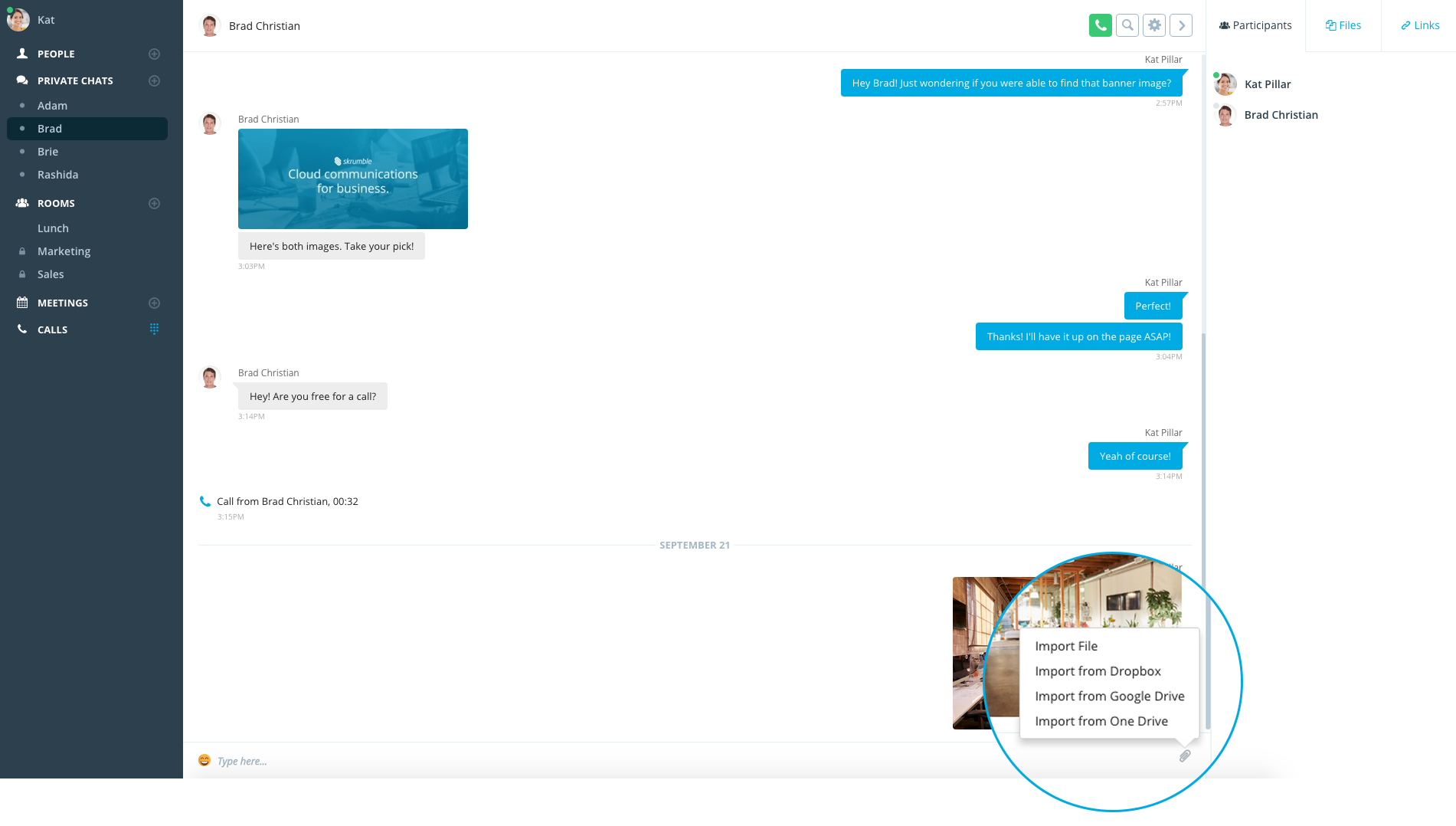 Skrumble is a communication program designed to improve team collaboration. In the user interface, there is a list of people that can be added to a group to communicate with everyone at the same time.