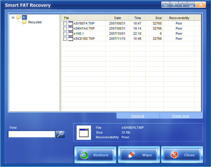 Smart FAT Recovery is a FAT recovery tool for Windows operating system that supports FAT 12/16/32 file system. Sofware easily recovers data from hard drives, digital camera and any type of storage media (flash drives, USB drives, Memory Stick, PC cards, multimedia cards, Secure Digital cards and floppy disks).