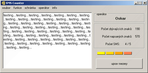 The program is for prescribing SMS and? for whatever reason. It contains functions for working with the mailbox, saving a parsed SMS, retrieving an already saved SMS, writing multiple SMS, removing unnecessary spaces from the message, as well as numerically and graphically shows the status of writing SMS, automatically remembers the last selected operator and the location of the window on the desktop. After writing the message, just place the text in the clipboard and then transfer it directly to the SMS gateway of the selected operator.