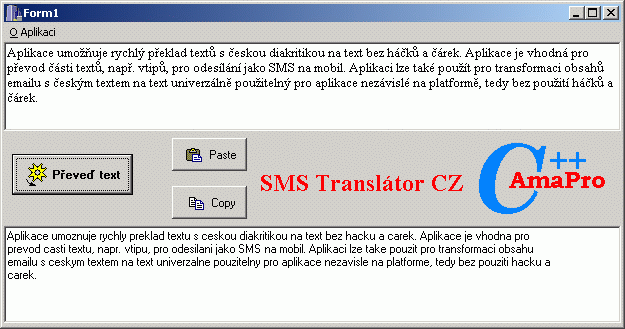 The application enables fast translation of texts with Czech accents into text without hooks and commas. The application is suitable for converting part of texts, e.g. jokes, for sending as SMS to mobile. The application can also be used to transform email content with Czech text into text that is universally usable for platform-independent applications, i.e. without the use of hooks and commas.