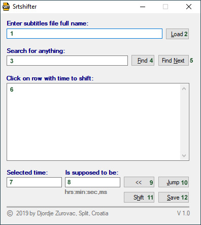 The application consists of a single window with a form. It does not require any installation, it is a so called one-click application. It also does not need to write anything to the registry or disk. The application only writes data to the loaded SRT file. To avoid unintentional loss of precious data, the FIRST time the subtitle file is opened, a backup file of the same size, same content, same name is created, with only an additional extension - '.original'.
