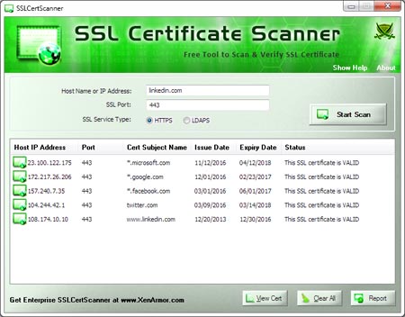 SSLCertScanner is an application for remote inspection and to obtain and validate SSL certificate of any host in an intranet or internet network. It watches for expired or untrusted certificates on your SSL servers. To check, simply enter the IP address or host name (for example, www.google.com). The certificate details will then be displayed along with the validation status.