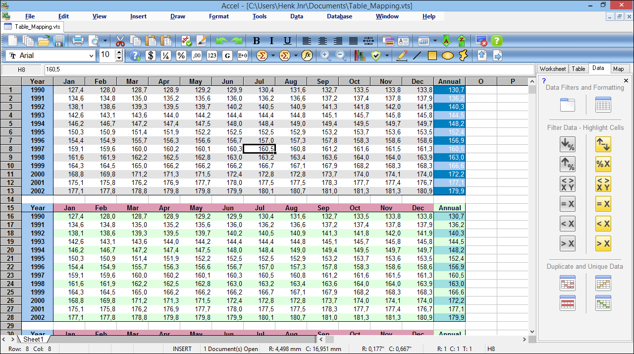 With a few mouse clicks, you can reorganize a spreadsheet to show or hide certain date ranges or formats according to specific conditions, or also quickly calculate subtotals and totals. The tool automatically allows you to present the resulting spreadsheet data in dynamic charts that update when the data changes. Compatible with MS Office - (VTS, txt, xls, csv).