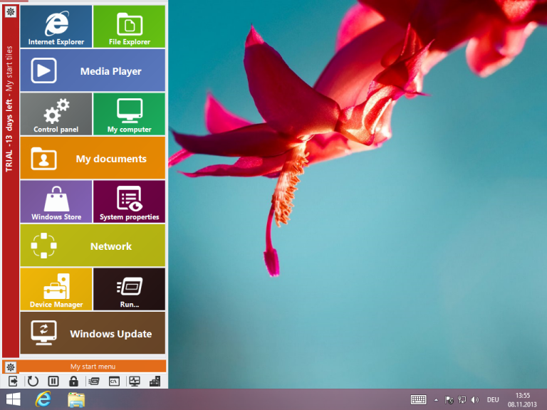 StartBar8 is a program for Windows 8 users that adds a customizable bar to the left side of the screen. The bar is displayed by hovering the cursor over the area and can be customized to perform individual actions such as opening a file or folder, shutting down the computer, restarting or locking, etc.