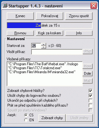 If an error occurs during startup, you can leave the program running to fix it, otherwise it will terminate itself after all tasks are completed. The settings are saved in an INI file in the program directory, as well as any error log. Each computer user has their own configuration. The program is easy to use, it is in both English and Czech and does not stay in memory or write anything to the registry when it is finished. However, you have to add it manually to the "After Running" folder yourself.