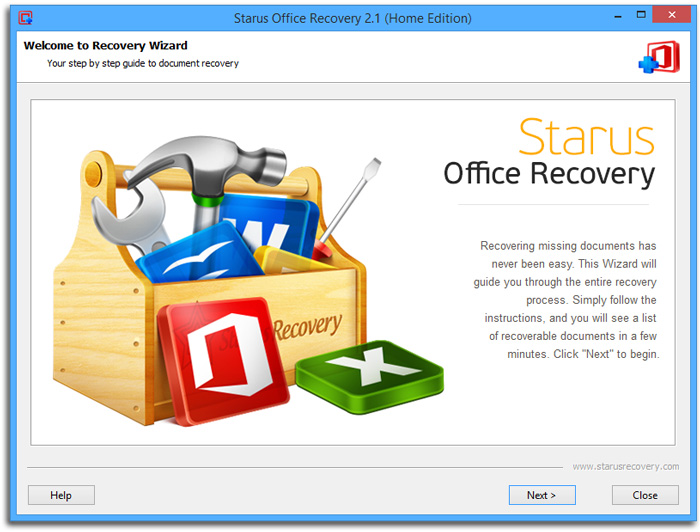 Starus Office Recovery is a program for recovering documents from damaged and inaccessible disk storage, formatted partitions or unreadable memory cards. It finds lost files in many formats (Word documents, Excel spreadsheets, presentations created in PowerPoint, Adobe PDF files, or other formats used by Microsoft Office and OpenOffice applications).