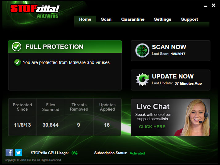 STOPzilla Antivirus is real-time protection that effectively detects, blocks and isolates infections before they can invade and damage your system. From the moment you turn on your computer, STOPzilla protects against malicious programs.