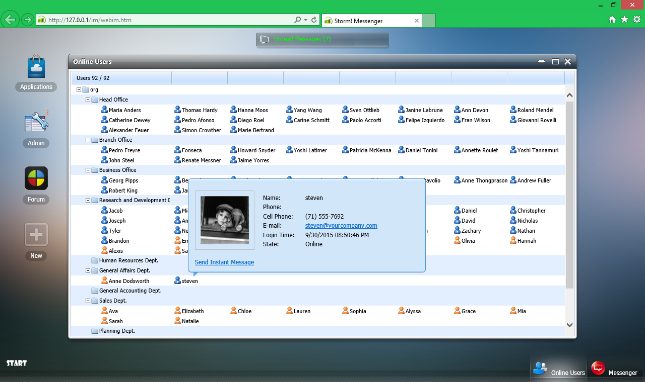 Storm Web Messenger+ is an IM (Instant Messaging) implementation designed especially for businesses. Using a server-based organizational structure, employees can easily locate and communicate with other members. The tool is based on HTTP server and SQLite database and supports various web browsers such as Opera, Firefox, Chrome, Safari and Windows EDGE. It works similarly to QQ or MSN or AOL.