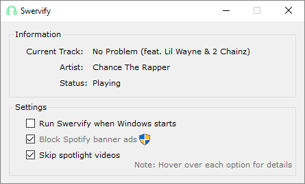 Swervify is a simple app that lets you block ads in the Spotify music app. In the settings you need to check " block banner ads and spotlight videos ". To block ad banners, you need to run the program with administrator privileges.