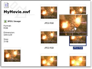 SWF Extractor allows you to convert all assets (images, sounds) from a Flash file to JPEG or PNG format or MP3 and WAV for sounds. You can preview images and sounds in the thumbnail viewer and then extract them easily. You can also move files by dragging and dropping them into other applications and also integrate them into Internet Explorer. Videos can be viewed directly in the program.