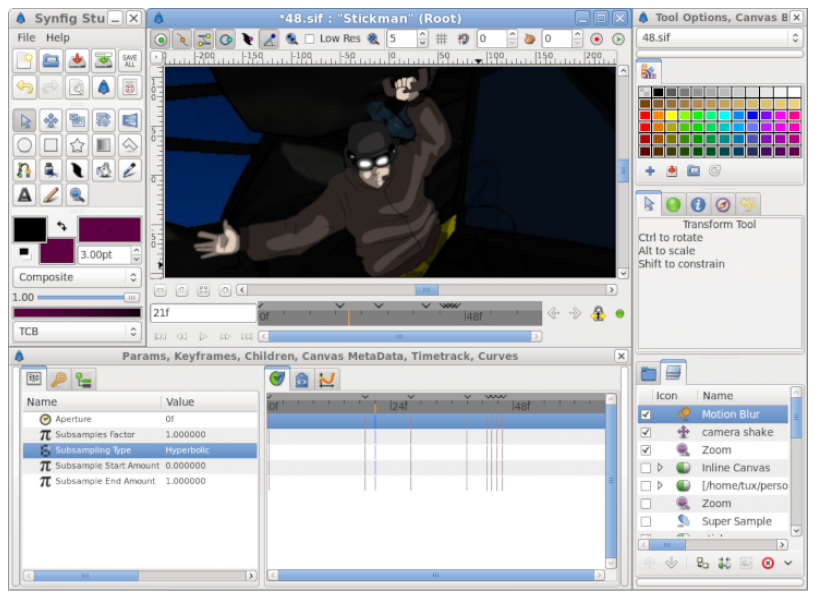 Synfig Studio is a 2D vector and timeline based animation software. You can use this application to create full-length quality animations, web animations, commercials, etc. The program has a long list of features such as: support for many layers (filters, transitions, transforms, fractal and many more), spatial resolution -independence, temporal resolution independence, High Dynamic-Range Imaging (HDRI), pentablet-friendly tools, artist-oriented design etc. New features such as tools or frame-by-frame animation that expands the capabilities of this program.