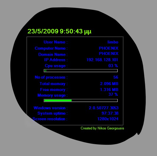 SYSTEM INFO SCREEN SAVER is a screensaver that displays the status of the system and its activities. It displays e.g.: user name, Windows version, IP address, CPU usage, number of processes, memory usage, etc. It offers the possibility of setting properties and display parameters.