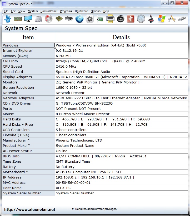 System Spec shows you all the information about your system that you can save and print. The program displays information about CPU, ports, memory status, video card, HDD, applications, memory, internet, CD/DVD drives, etc. The program does not need to be installed.