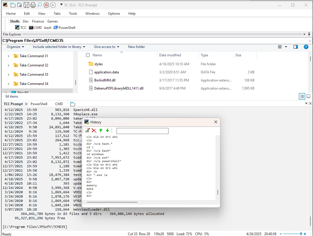 Take Command is a comprehensive interactive tool with a Windows command line GUI that makes your commands clearer and more efficient. Take Command includes optional Explorer-style integration with console window tabs. Major improvements over standard Windows CMD commands such as COPY, DEL, MOVE, SET and START, this tool adds over 160 new commands. Command line editing and thousands of other features are significantly improved.