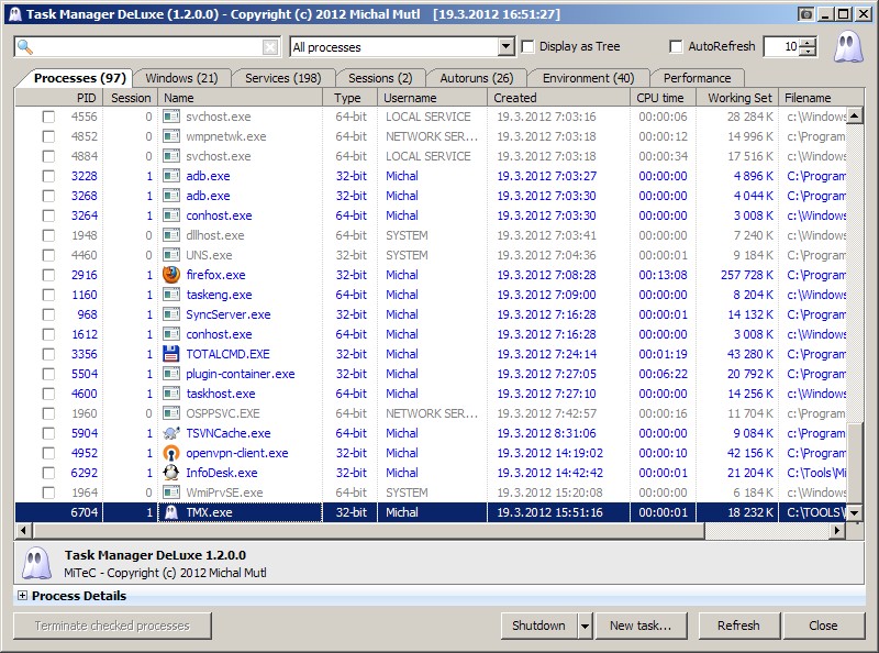 Task Manager DeLuxe is a simple process manager that is able to provide details about CPU performance, memory and you can also view running processes. As it is a portable program it is important to mention that it leaves no traces in the registry. Task Manager DeLuxe has a simple interface that allows you to view a list of all processes that are currently running and information about them such as PID, name, type, username, date they were created, CPU and memory usage or location.